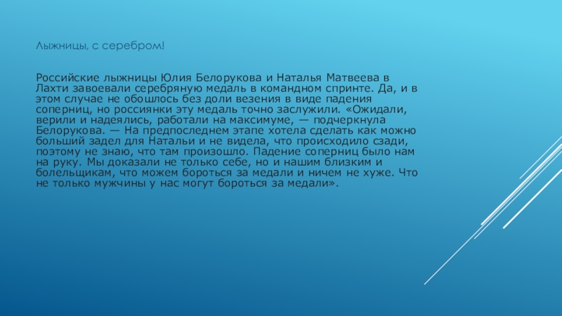 завоевали серебряную медаль в командном спринте. Да, и в этом случае не обошлось без доли везения в виде падения соперниц, но россиянки эту медаль точно заслужили. «Ожидали, верили и надеялись, работали на максимуме, — подчеркнула Белорукова. — На предпоследнем этапе хотела сделать как можно больший задел для Натальи и не видела, что происходило сзади, поэтому не знаю, что там произошло. Падение соперниц было нам на руку. Мы доказали не только себе, но и нашим близким и болельщикам, что можем бороться за медали и ничем не хуже. Что не только мужчины у нас могут бороться за медали».
