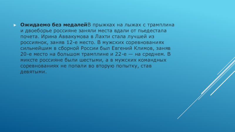 Слайд 9Ожидаемо без медалейВ прыжках на лыжах с трамплина и двоеборье россияне