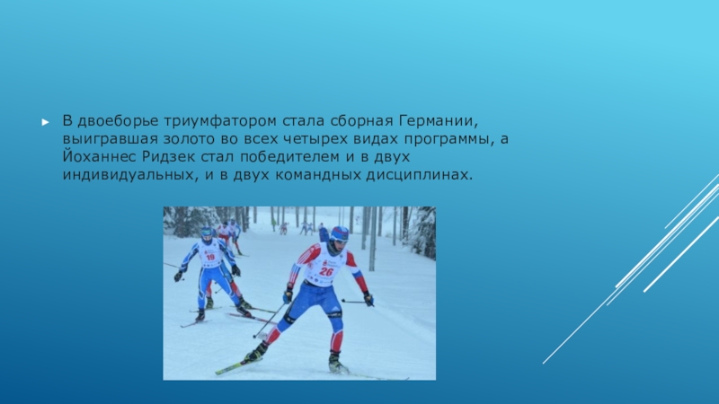 Слайд 11В двоеборье триумфатором стала сборная Германии, выигравшая золото во всех четырех