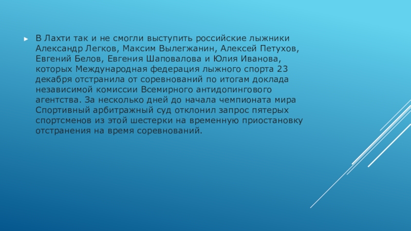 Максим Вылегжанин, Алексей Петухов, Евгений Белов, Евгения Шаповалова и Юлия Иванова, которых Международная федерация лыжного спорта 23 декабря отстранила от соревнований по итогам доклада независимой комиссии Всемирного антидопингового агентства. За несколько дней до начала чемпионата мира Спортивный арбитражный суд отклонил запрос пятерых спортсменов из этой шестерки на временную приостановку отстранения на время соревнований.