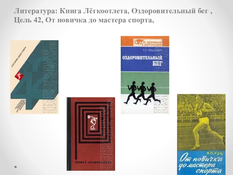 Слайд 12Литература: Книга Лёгкоотлета, Оздоровительный бег , Цель 42, От новичка до