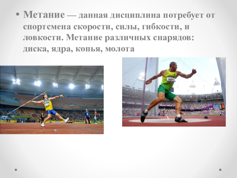 Слайд 7Метание — данная дисциплина потребует от спортсмена скорости, силы, гибкости, и