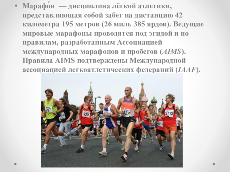 Слайд 10Марафо́н  — дисциплина лёгкой атлетики, представляющая собой забег на дистанцию 42 километра 195