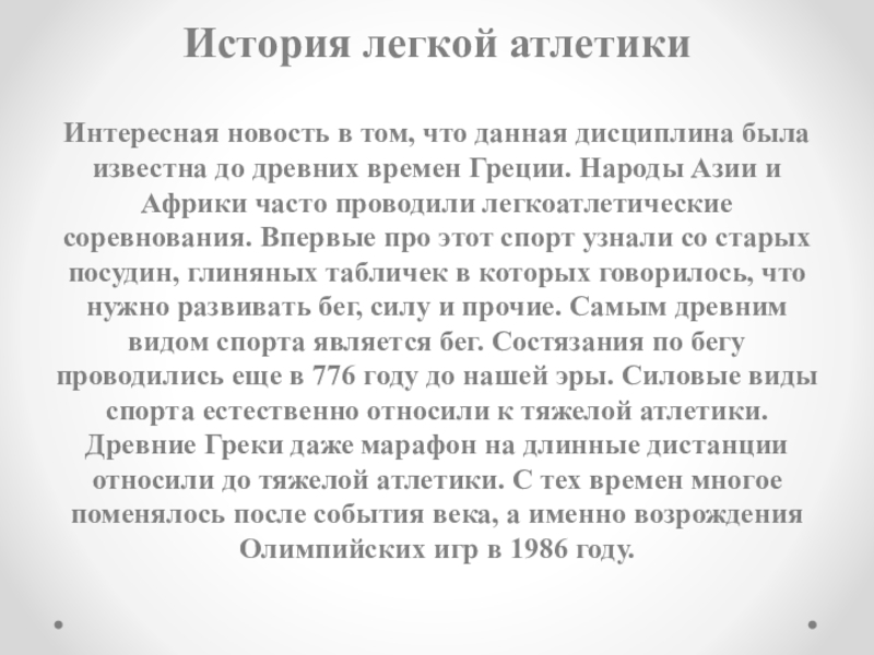 до древних времен Греции. Народы Азии и Африки часто проводили легкоатлетические соревнования. Впервые про этот спорт узнали со старых посудин, глиняных табличек в которых говорилось, что нужно развивать бег, силу и прочие. Самым древним видом спорта является бег. Состязания по бегу проводились еще в 776 году до нашей эры. Силовые виды спорта естественно относили к тяжелой атлетики. Древние Греки даже марафон на длинные дистанции относили до тяжелой атлетики. С тех времен многое поменялось после события века, а именно возрождения Олимпийских игр в 1986 году.