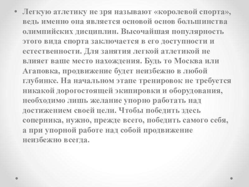 основой основ большинства олимпийских дисциплин. Высочайшая популярность этого вида спорта заключается в его доступности и естественности. Для занятия легкой атлетикой не влияет ваше место нахождения. Будь то Москва или Агаповка, продвижение будет неизбежно в любой глубинке. На начальном этапе тренировок не требуется никакой дорогостоящей экипировки и оборудования, необходимо лишь желание упорно работать над достижением своей цели. Чтобы победить здесь соперника, нужно, прежде всего, победить самого себя, а при упорной работе над собой продвижение неизбежно всегда.