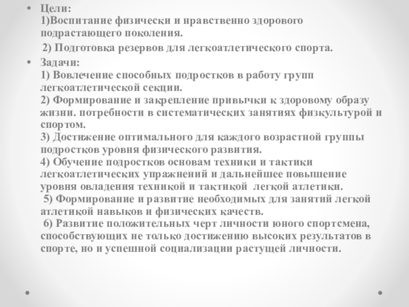 Цели: 1)Воспитание физически и нравственно здорового подрастающего поколения.   2) Подготовка резервов для легкоатлетического спорта.Задачи:  1)