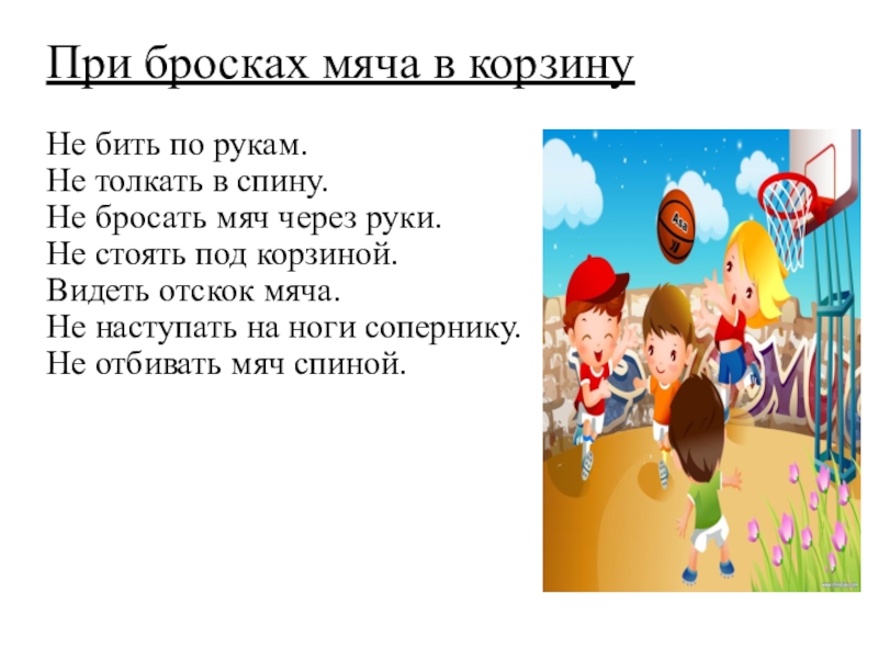 При бросках мяча в корзинуНе бить по рукам.Не толкать в спину.Не бросать мяч через руки.Не стоять под