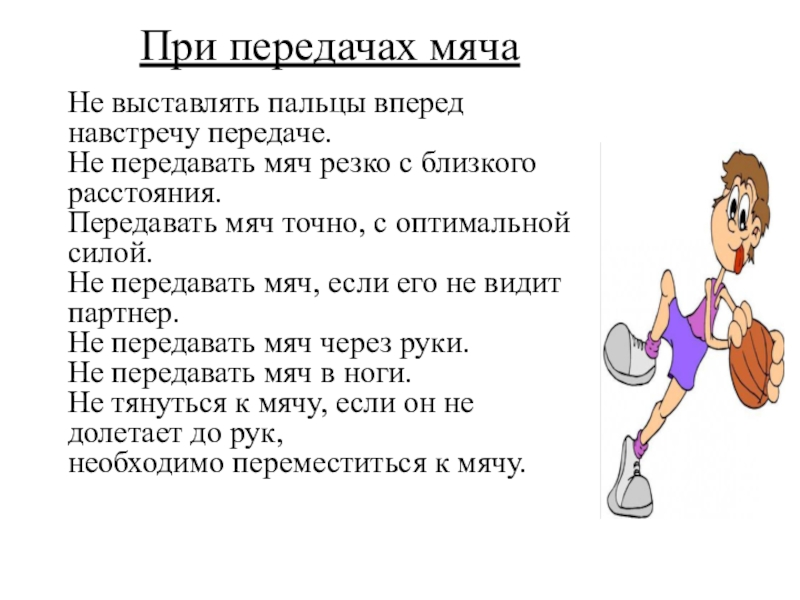 При передачах мячаНе выставлять пальцы вперед навстречу передаче.Не передавать мяч резко с близкого расстояния.Передавать мяч точно, с
