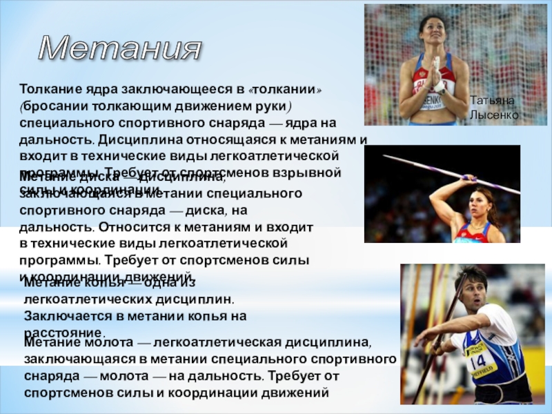 Метания:толкание ядра, метание диска, метание копья, метание молота.