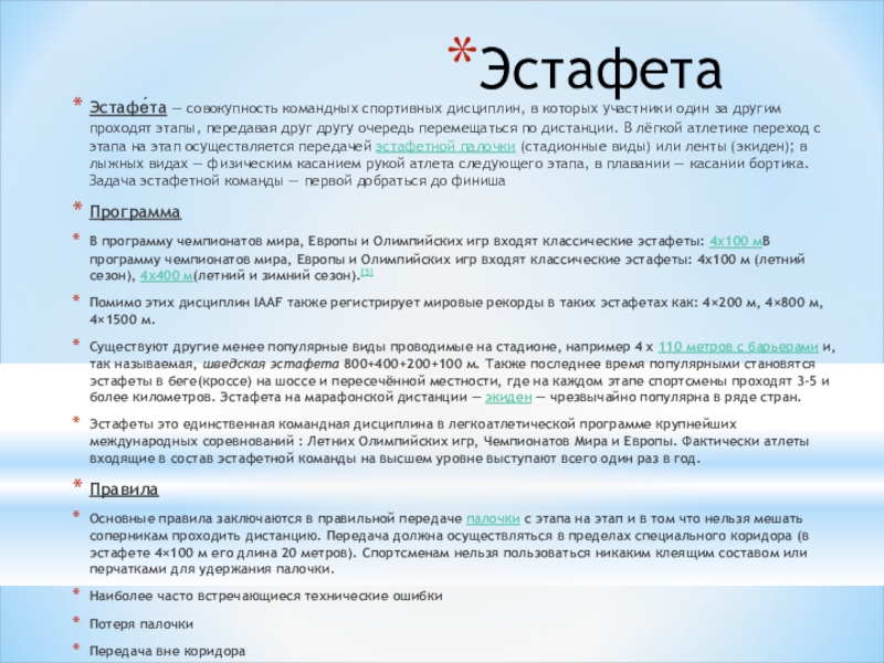 Эстафе́та — совокупность командных спортивных дисциплин, в которых участники один за другим