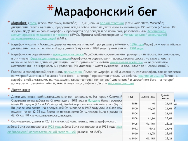 Марафо́н (греч. (греч. Μαραθών, Marathṓn) — дисциплина лёгкой атлетики (греч. Μαραθών, Marathṓn) — дисциплина лёгкой атлетики, представляющая собой забег на дистанцию