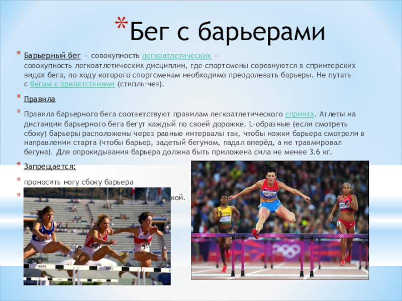видах бега, по ходу которого спортсменам необходимо преодолевать барьеры. Не путать с бегом с препятствиями (стипль-чез).