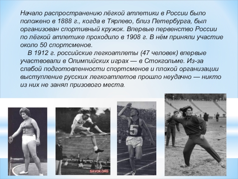 В 1912 г. российские легкоатлеты (47 человек) впервые участвовали в Олимпийских играх — в Стокгольме. Из-за слабой подготовленности спортсменов и плохой организации выступление русских легкоатлетов прошло неудачно — никто из них не занял призового места.