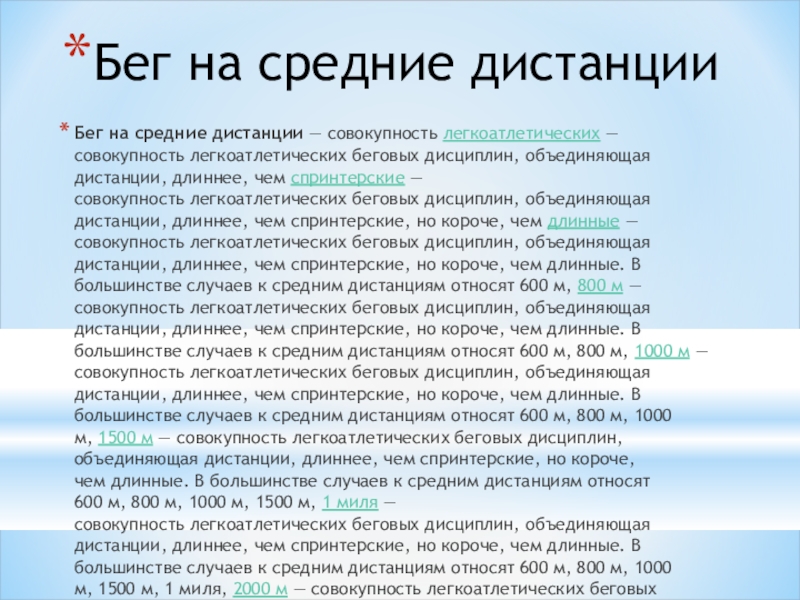 Бег на средние дистанции — совокупность легкоатлетических — совокупность легкоатлетических беговых дисциплин, объединяющая