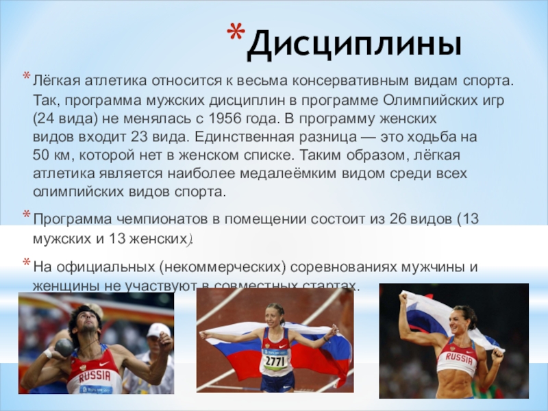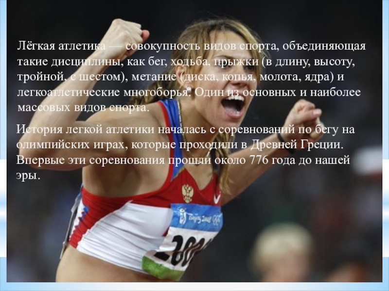 Слайд 4Лёгкая атлетика — совокупность видов спорта, объединяющая такие дисциплины, как бег,