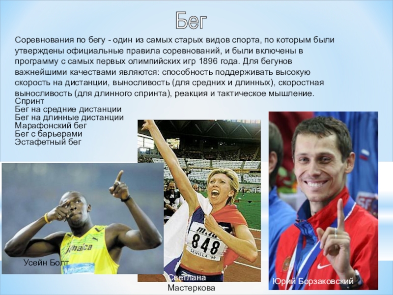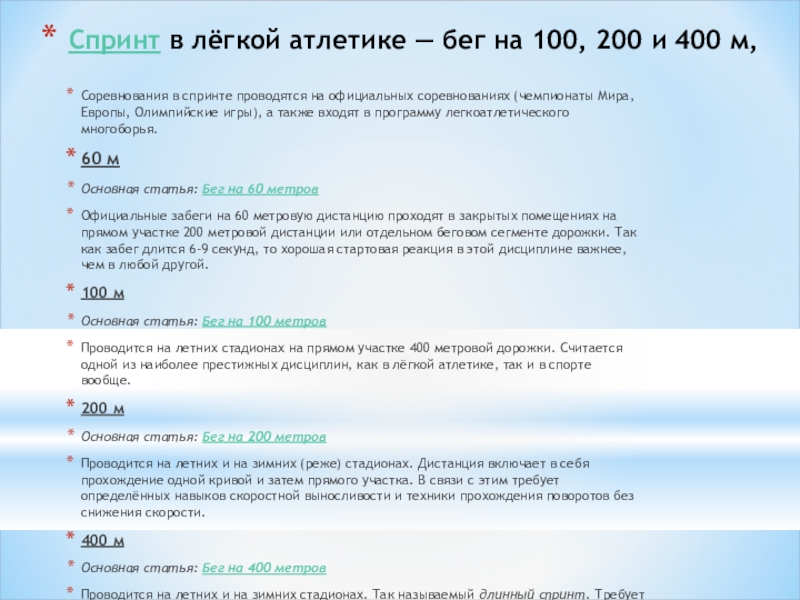 Слайд 13Спринт в лёгкой атлетике — бег на 100, 200 и 400 м,
