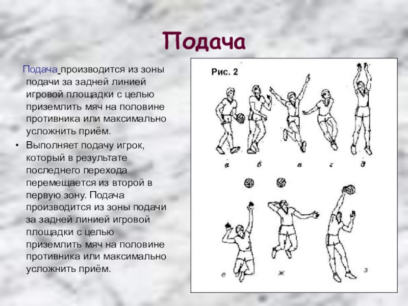 Выполняет подачу игрок, который в результате последнего перехода перемещается из второй в первую зону. Подача производится из зоны подачи за задней линией игровой площадки с целью приземлить мяч на половине противника или максимально усложнить приём.