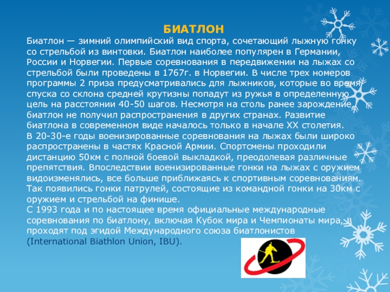 Биатлон — зимний олимпийский вид спорта, сочетающий лыжную гонку со стрельбой из винтовки. Биатлон наиболее популярен в Германии, России и Норвегии. Первые соревнования в передвижении на лыжах со стрельбой были проведены в 1767г. в Норвегии. В числе трех номеров программы 2 приза предусматривались для лыжников, которые во время спуска со склона средней крутизны попадут из ружья в определенную цель на расстоянии 40-50 шагов. Несмотря на столь ранее зарождение, биатлон не получил распространения в других странах. Развитие биатлона в современном виде началось только в начале XX столетия.