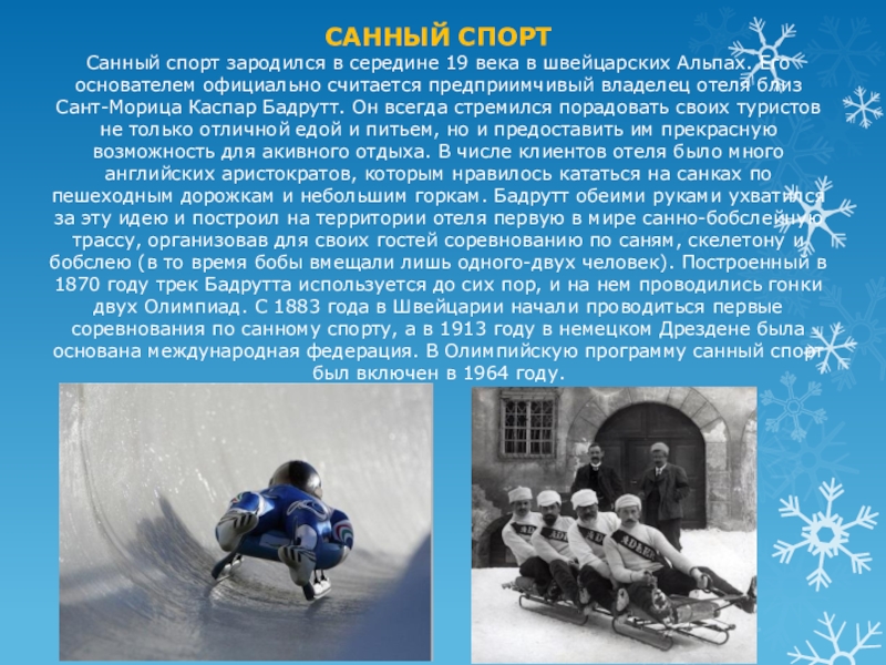 Санный спорт зародился в середине 19 века в швейцарских Альпах.