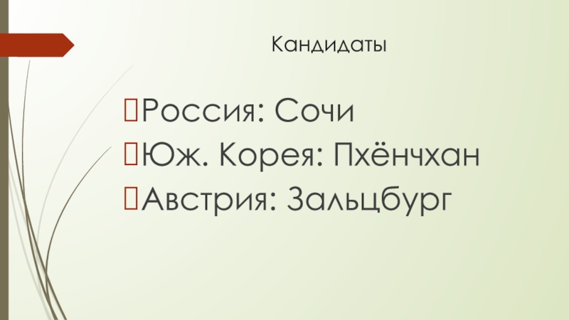 КандидатыРоссия: СочиЮж. Корея: ПхёнчханАвстрия: Зальцбург