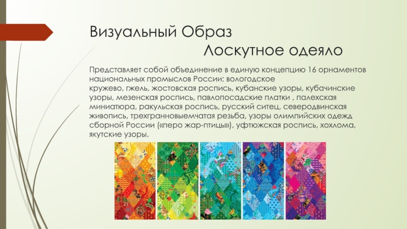 Визуальный Образ Лоскутное одеялоПредставляет собой объединение в единую концепцию 16 орнаментов национальных промыслов России: вологодское кружево, гжель, жостовская роспись, кубанские