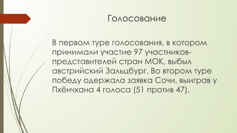 МОК, выбыл австрийский Зальцбург. Во втором туре победу одержала заявка Сочи, выиграв у Пхёнчхана 4 голоса (51 против 47).