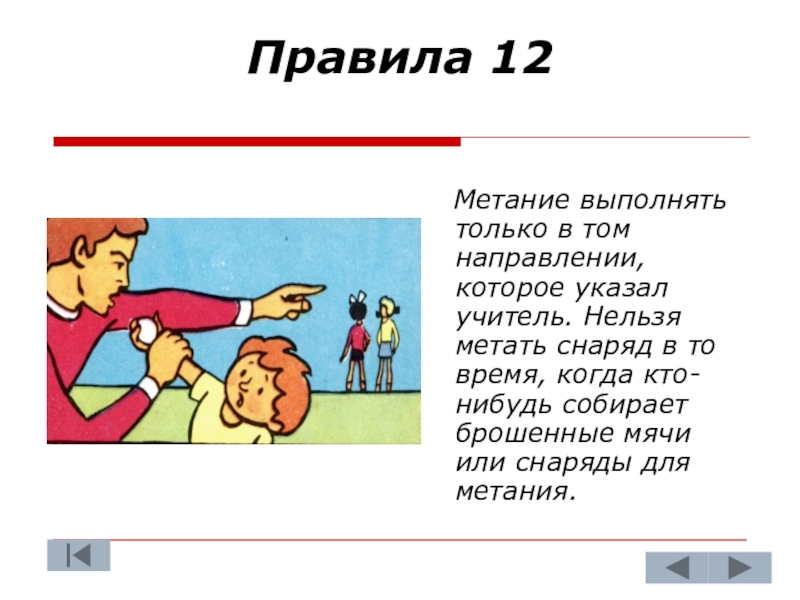 том направлении, которое указал учитель. Нельзя метать снаряд в то время, когда кто-нибудь собирает брошенные мячи или снаряды для метания.