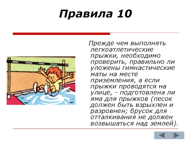 проверить, правильно ли уложены гимнастические маты на месте приземления, а если прыжки проводятся на улице, - подготовлена ли яма для прыжков (песок должен быть взрыхлен и разровнен; брусок для отталкивания не должен возвышаться над землей).