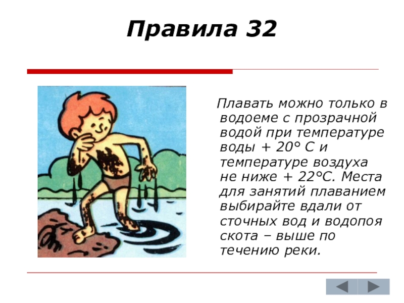 водой при температуре воды + 20° С и температуре воздуха не ниже + 22°С. Места для занятий плаванием выбирайте вдали от сточных вод и водопоя скота – выше по течению реки.