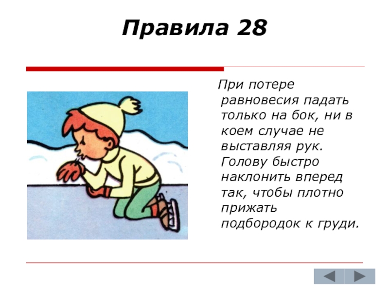 При потере равновесия падать только на бок, ни