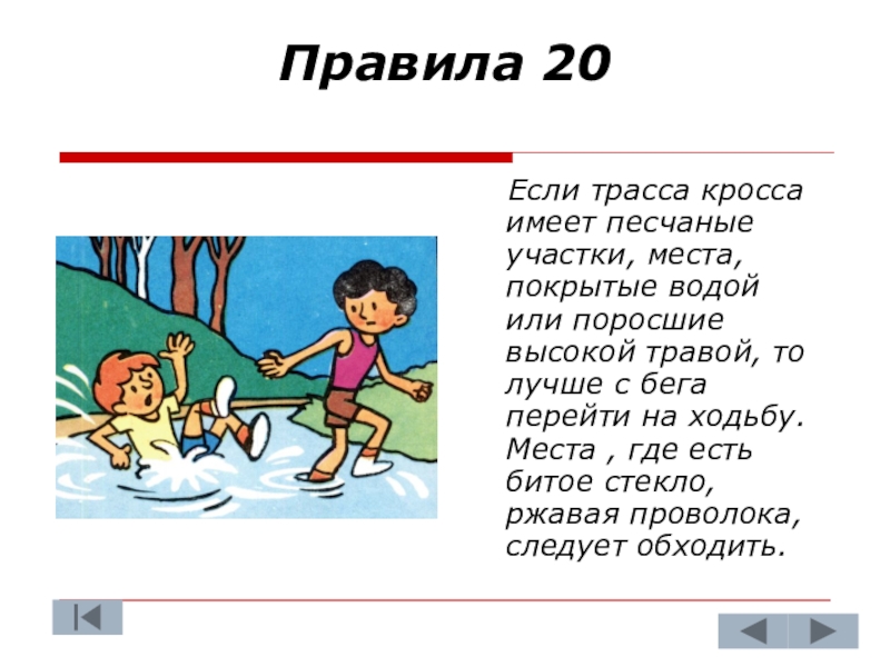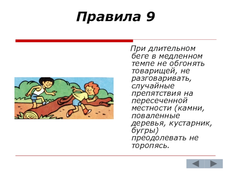 обгонять товарищей, не разговаривать, случайные препятствия на пересеченной местности (камни, поваленные деревья, кустарник, бугры) преодолевать не торопясь.