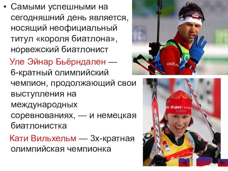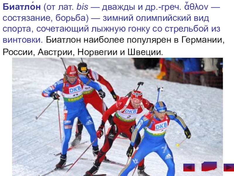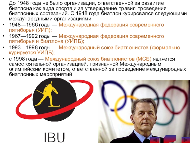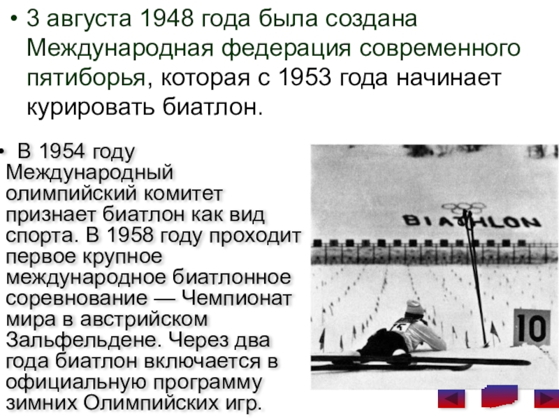 В 1954 году Международный олимпийский комитет признает биатлон как вид спорта. В 1958 году проходит первое крупное международное биатлонное соревнование — Чемпионат мира в австрийском Зальфельдене. Через два года биатлон включается в официальную программу зимних Олимпийских игр.