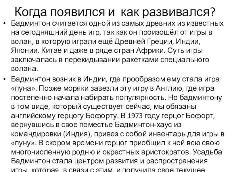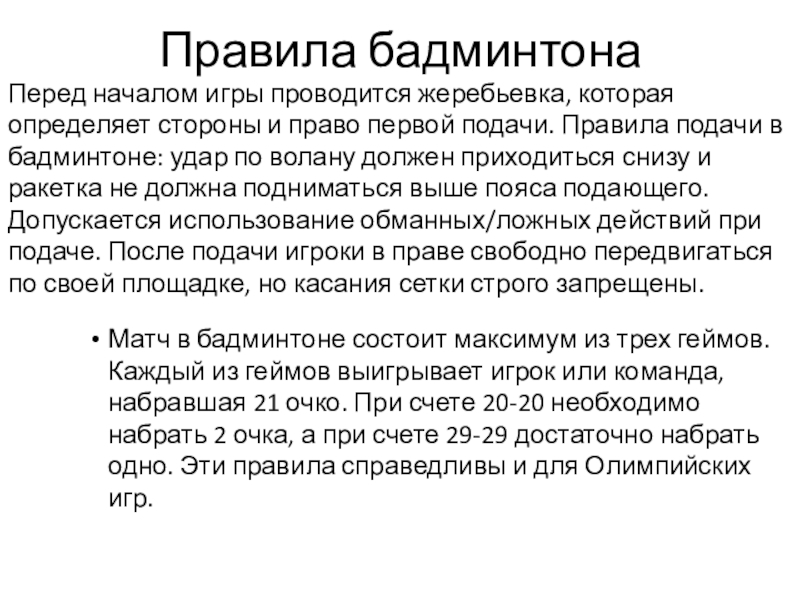 Перед началом игры проводится жеребьевка, которая определяет стороны и право первой подачи. Правила подачи в бадминтоне: удар по волану должен приходиться снизу и ракетка не должна подниматься выше пояса подающего. Допускается использование обманных/ложных действий при подаче. После подачи игроки в праве свободно передвигаться по своей площадке, но касания сетки строго запрещены.