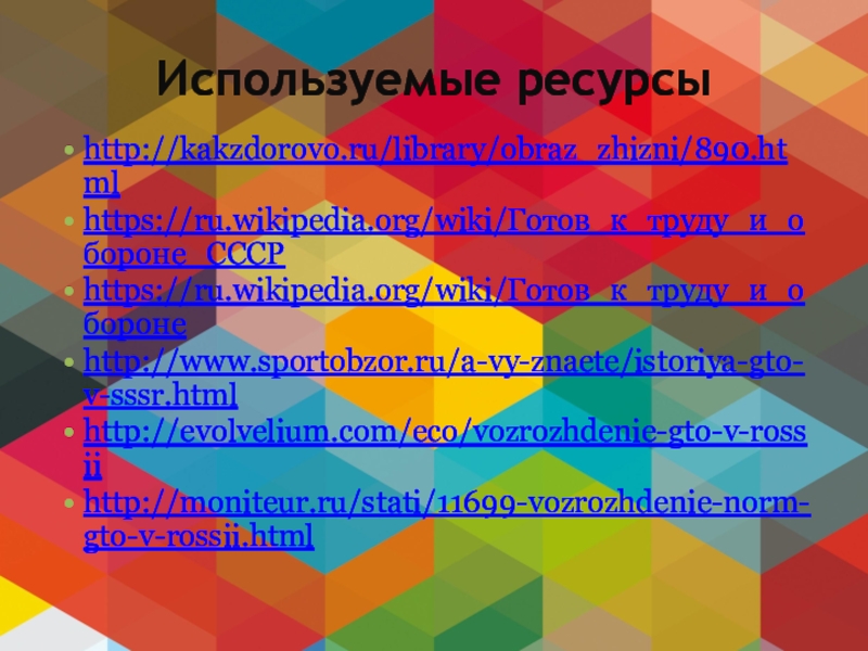 Используемые ресурсыhttp://kakzdorovo.ru/library/obraz_zhizni/890.htmlhttps://ru.wikipedia.org/wiki/Готов_к_труду_и_обороне_СССРhttps://ru.wikipedia.org/wiki/Готов_к_труду_и_оборонеhttp://www.sportobzor.ru/a-vy-znaete/istoriya-gto-v-sssr.htmlhttp://evolvelium.com/eco/vozrozhdenie-gto-v-rossiihttp://moniteur.ru/stati/11699-vozrozhdenie-norm-gto-v-rossii.html