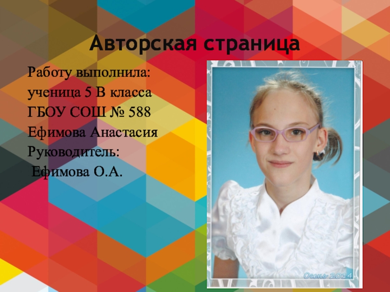 Авторская страницаРаботу выполнила:ученица 5 В классаГБОУ СОШ № 588Ефимова АнастасияРуководитель: Ефимова О.А.