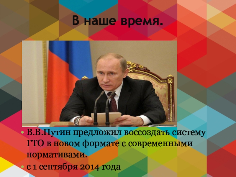 В наше время.В.В.Путин предложил воссоздать систему ГТО в новом формате с современными нормативами.с 1 сентября 2014 года