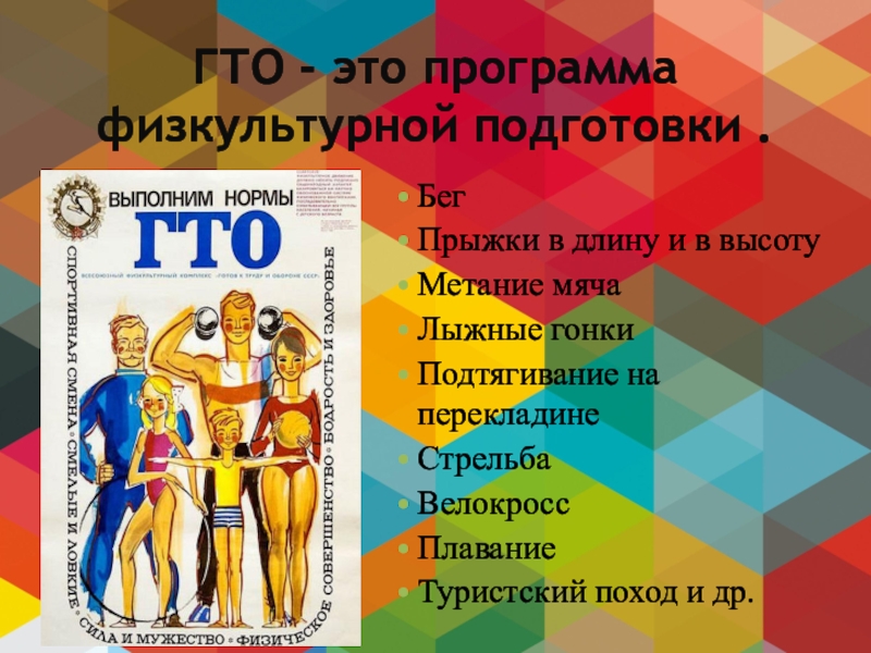 ГТО - это программа физкультурной подготовки .БегПрыжки в длину и в высотуМетание мячаЛыжные гонкиПодтягивание на перекладинеСтрельбаВелокроссПлаваниеТуристский поход и