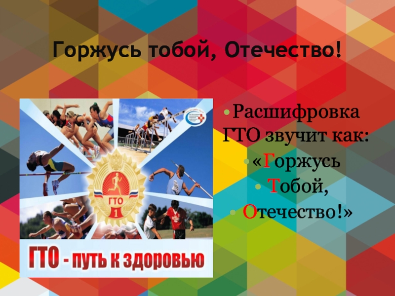 Горжусь тобой, Отечество!Расшифровка ГТО звучит как: «Горжусь Тобой, Отечество!»