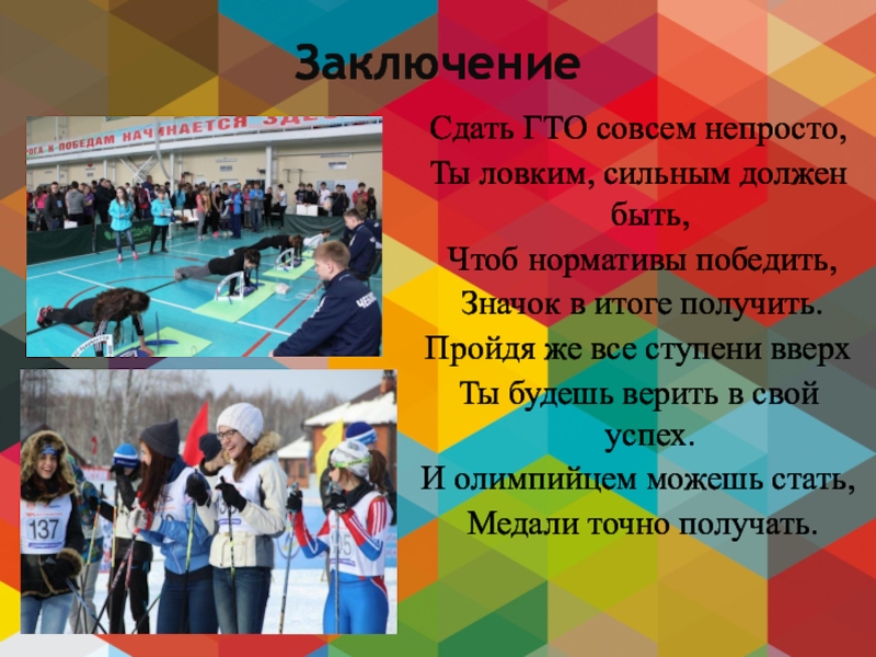 ЗаключениеСдать ГТО совсем непросто, Ты ловким, сильным должен быть, Чтоб нормативы победить, Значок в итоге получить.Пройдя же