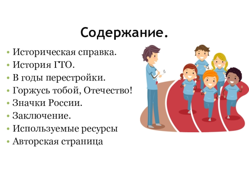 Содержание.Историческая справка.История ГТО.В годы перестройки.Горжусь тобой, Отечество! Значки России.Заключение. Используемые ресурсыАвторская страница