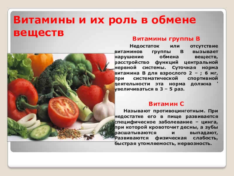 отсутствие витаминов группы В вызывает нарушение обмена веществ, расстройство функций центральной нервной системы. Суточная норма витамина В для взрослого 2 – ; 6 мг, при систематической спортивной деятельности эта норма должна ' увеличиваться в 3 – 5 раз.