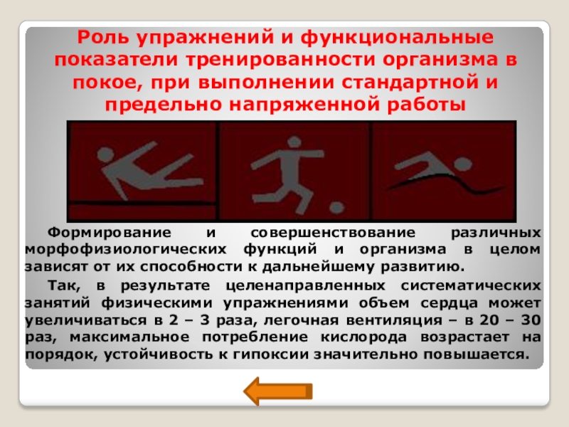 Слайд 10Роль упражнений и функциональные показатели тренированности организма в покое, при выполнении