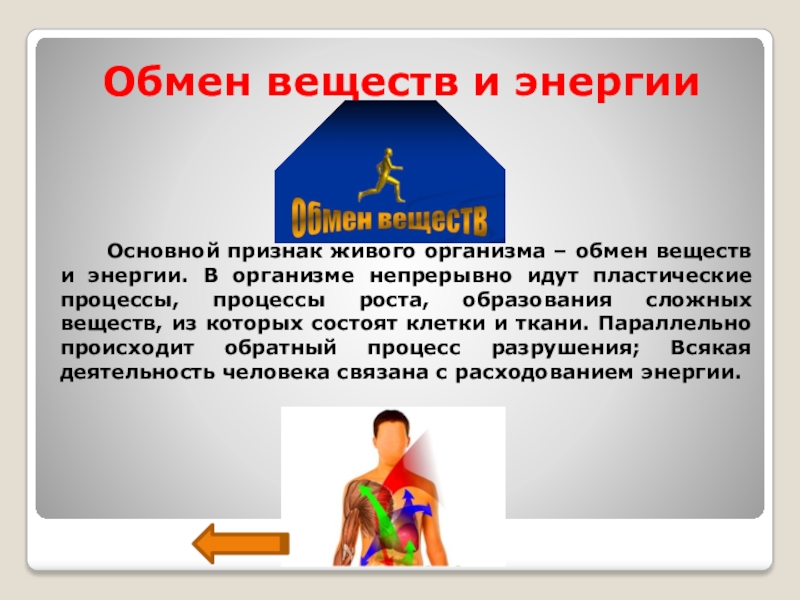 энергии. В организме непрерывно идут пластические процессы, процессы роста, образования сложных веществ, из которых состоят клетки и ткани. Параллельно происходит обратный процесс разрушения; Всякая деятельность человека связана с расходованием энергии.