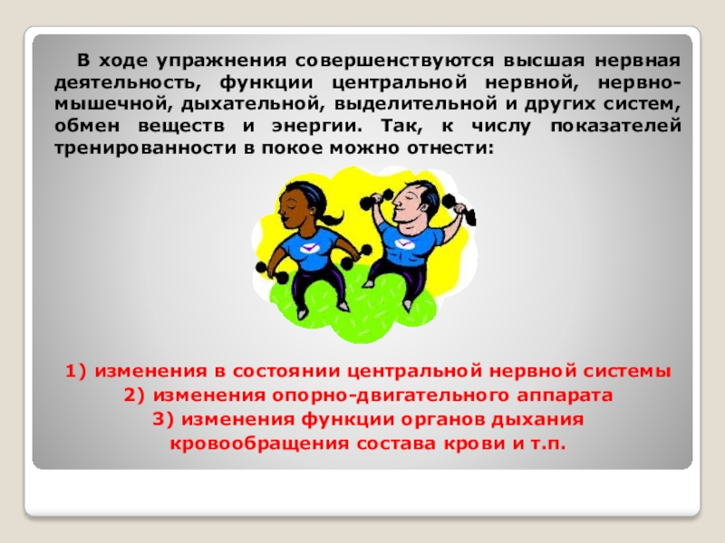 нервно-мышечной, дыхательной, выделительной и других систем, обмен веществ и энергии. Так, к числу показателей тренированности в покое можно отнести: