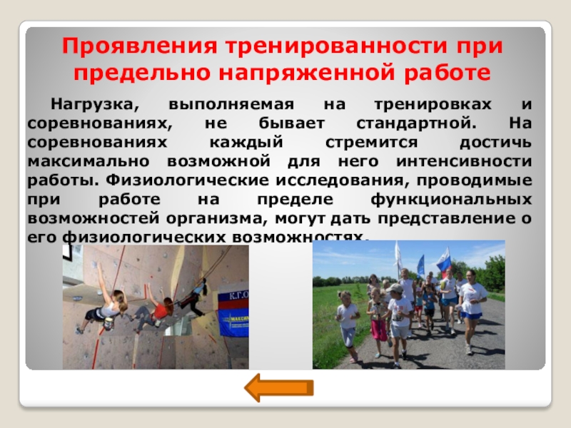 Слайд 13Проявления тренированности при предельно напряженной работе