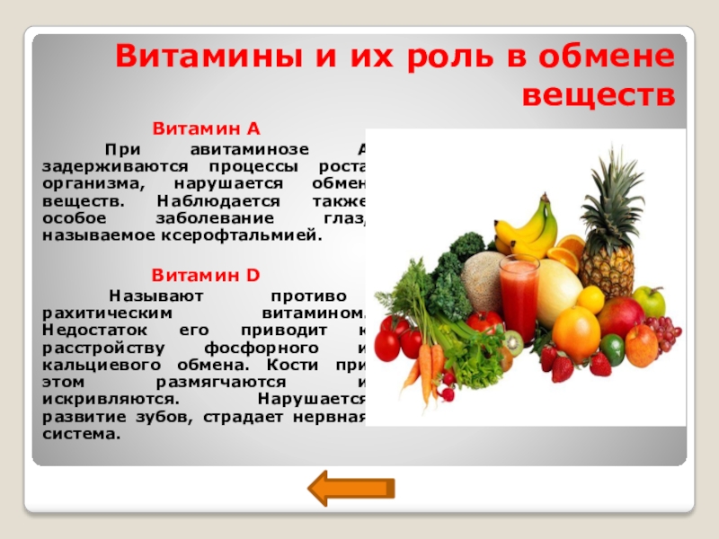 Называют противо рахитическим витамином. Недостаток его приводит к расстройству фосфорного и кальциевого обмена. Кости при этом размягчаются и искривляются. Нарушается развитие зубов, страдает нервная система.