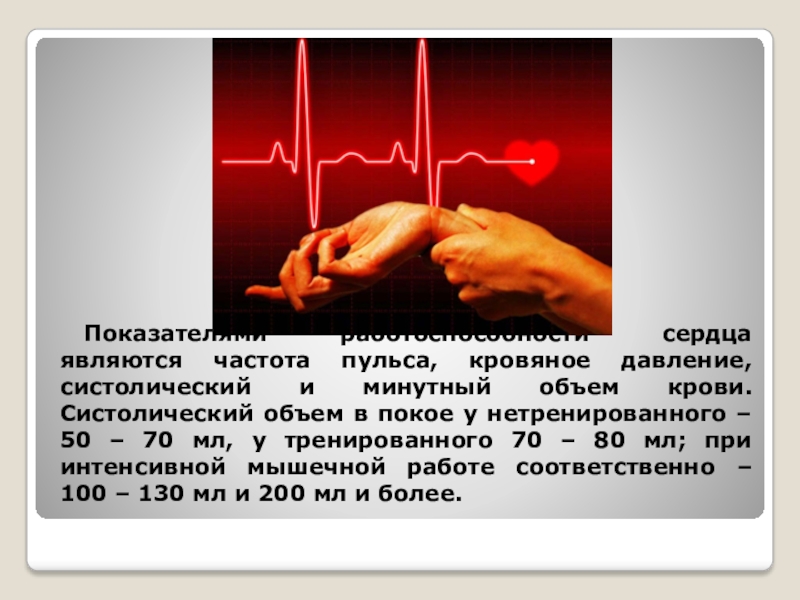 Показателями работоспособности сердца являются частота пульса, кровяное давление, систолический и