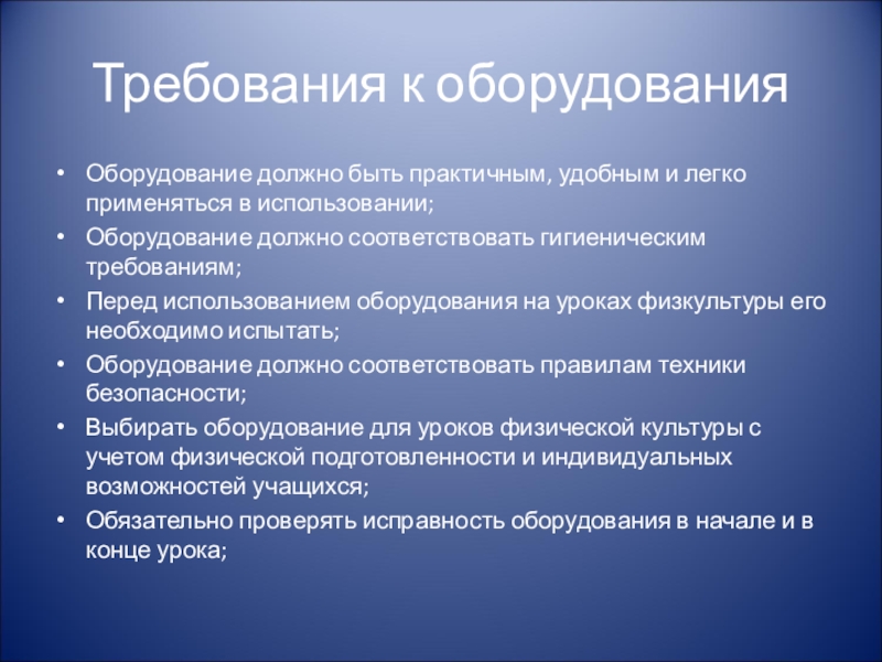 Требования к оборудованияОборудование должно быть практичным, удобным и легко применяться в использовании;Оборудование должно соответствовать гигиеническим требованиям;Перед использованием