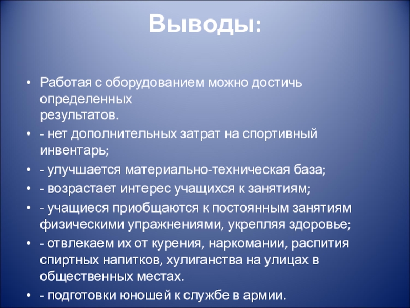 Выводы: Работая с оборудованием можно достичь определенных результатов.- нет дополнительных затрат на спортивный инвентарь;- улучшается материально-техническая база;
