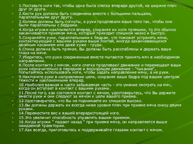 11.После того, как состоялся контакт с мячом, удостоверьтесь, что Вы держите вместе руки и они следуют за мячом к цели вашего приема.